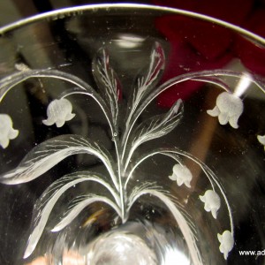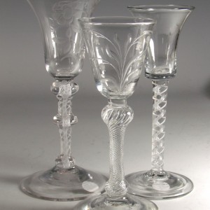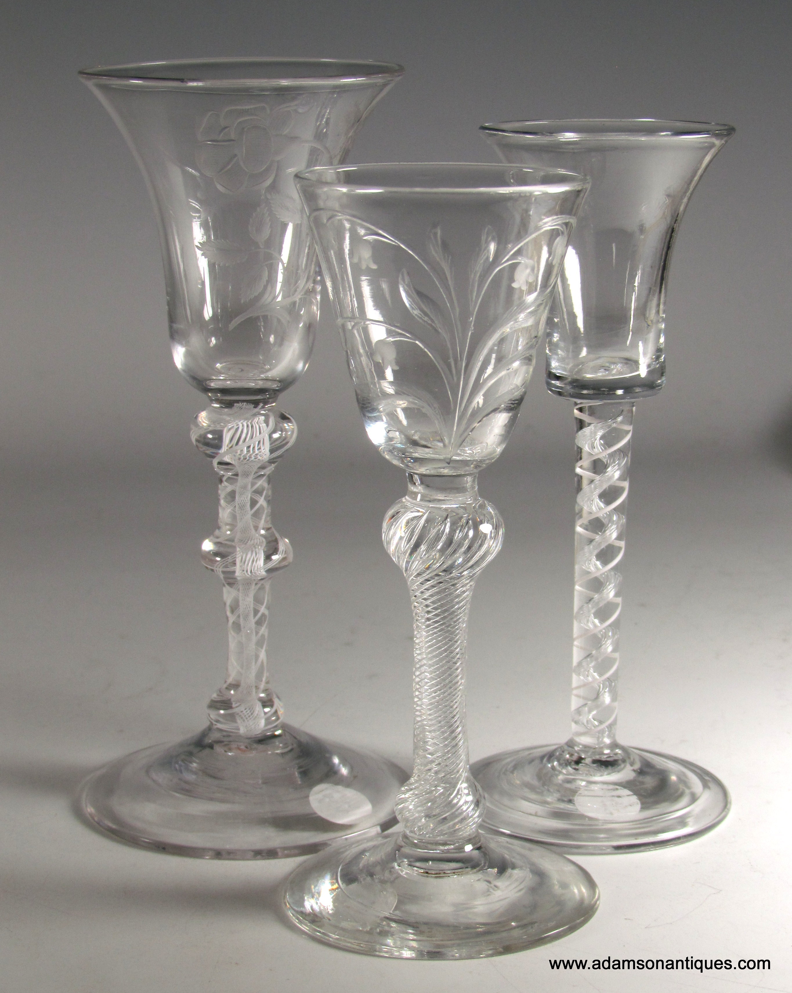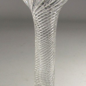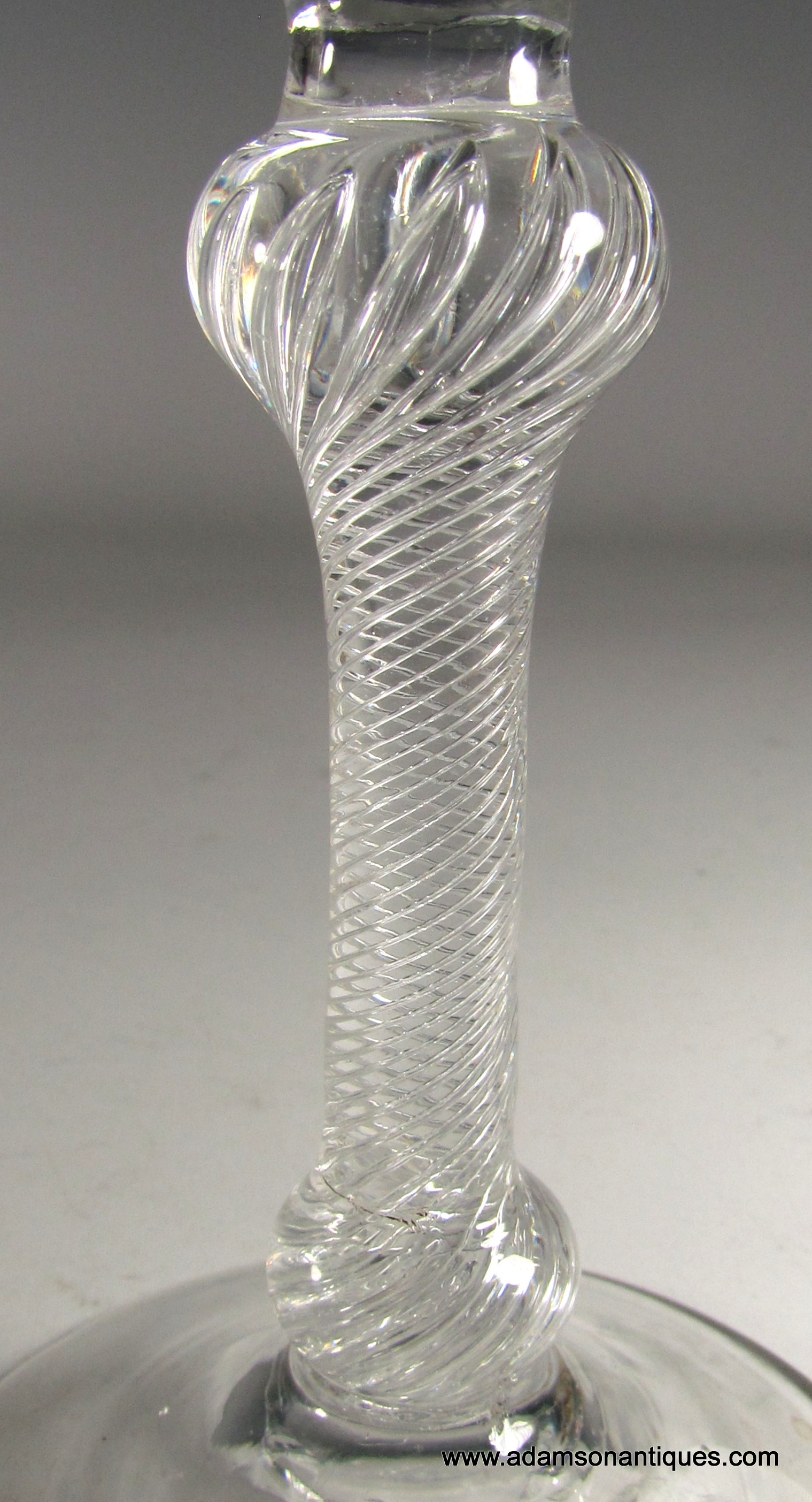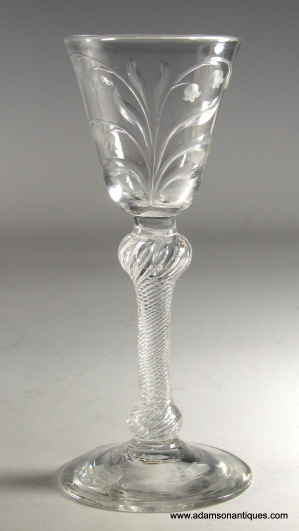 A lovely air twist wine glass, having a round funnel bowl finely engraved with Lily of the valley with polished details ,on a multi spiral air twist stem with shoulder and basal knops, all on a plain conical foot with a pronounced shear mark.