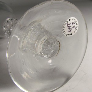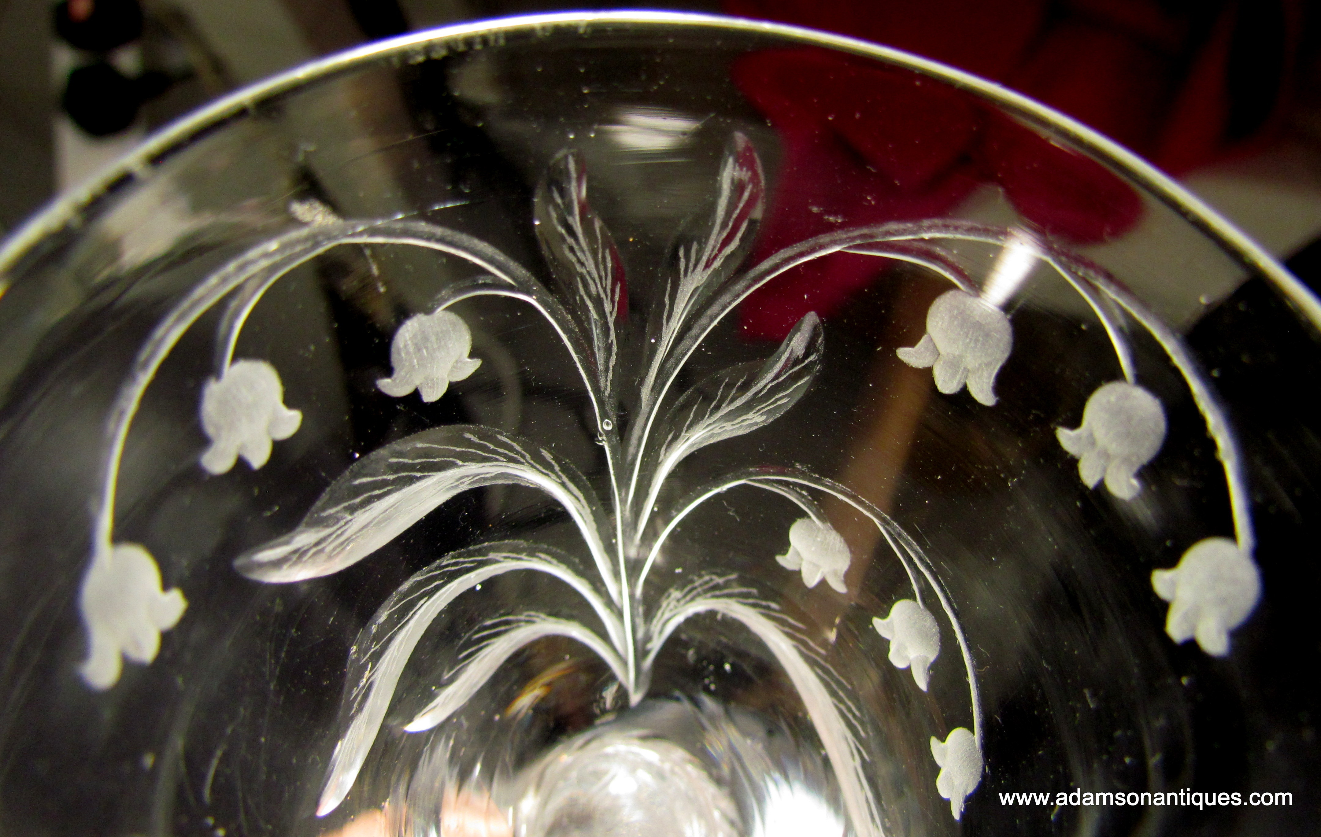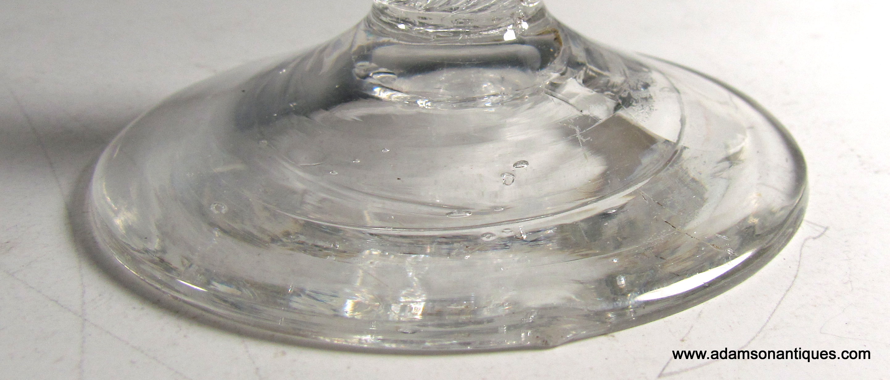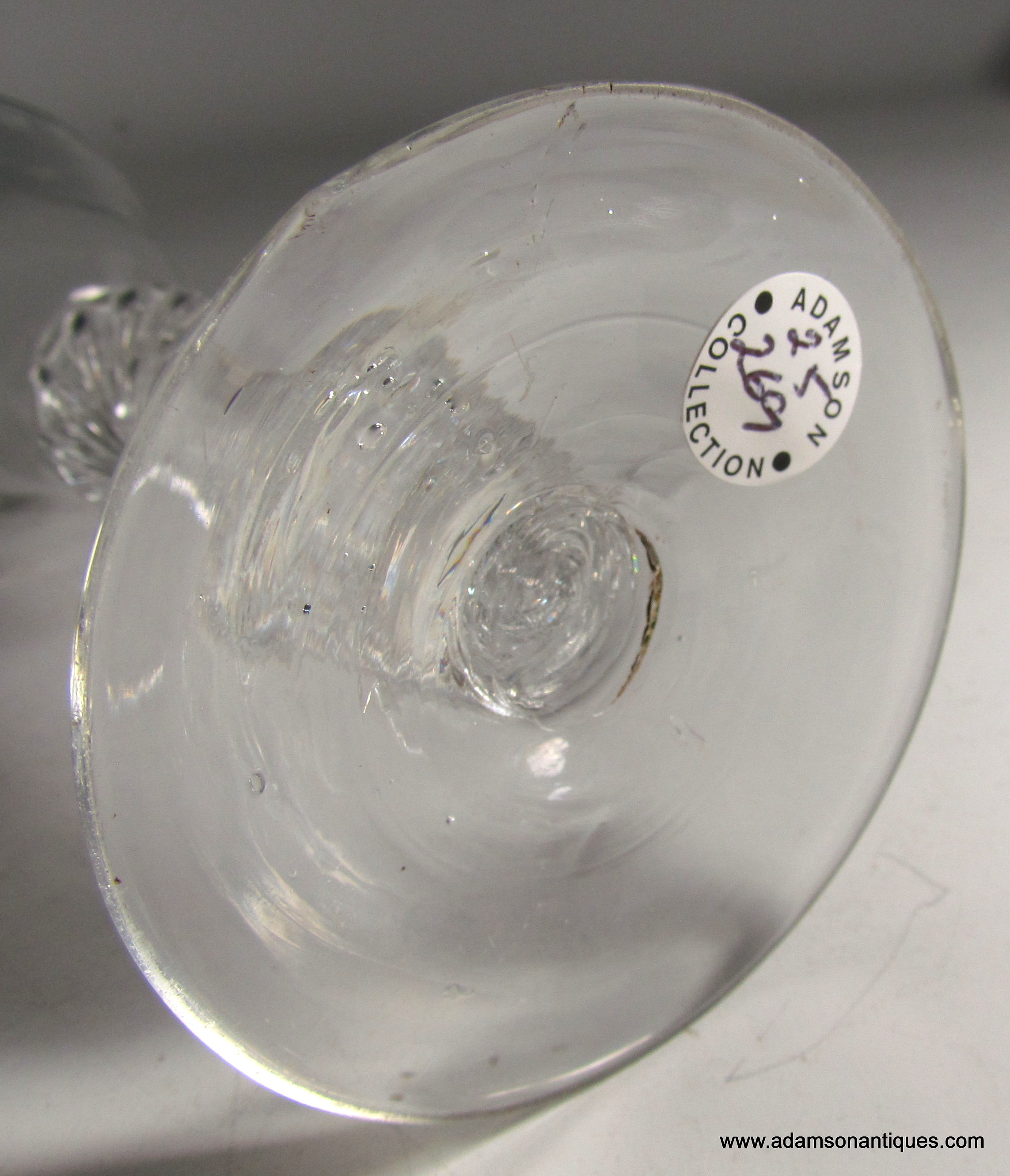 A lovely air twist wine glass, having a round funnel bowl finely engraved with Lily of the valley with polished details ,on a multi spiral air twist stem with shoulder and basal knops, all on a plain conical foot with a pronounced shear mark.
