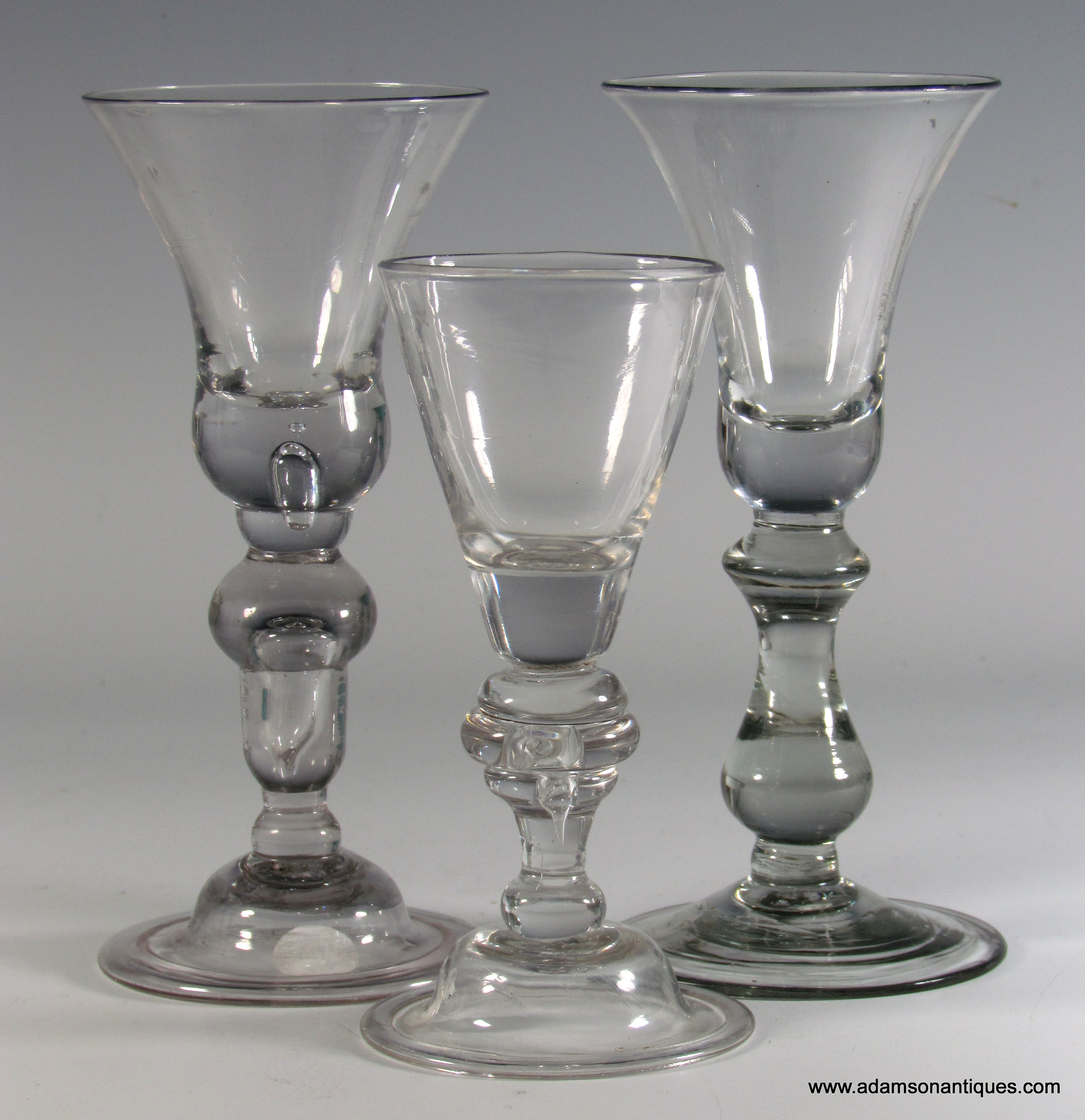 A very nice baluster wine glass , having a conical bowl with solid bases over a stem with a teared heavy triple annular knop and basal knop , all on a domed and folded foot .