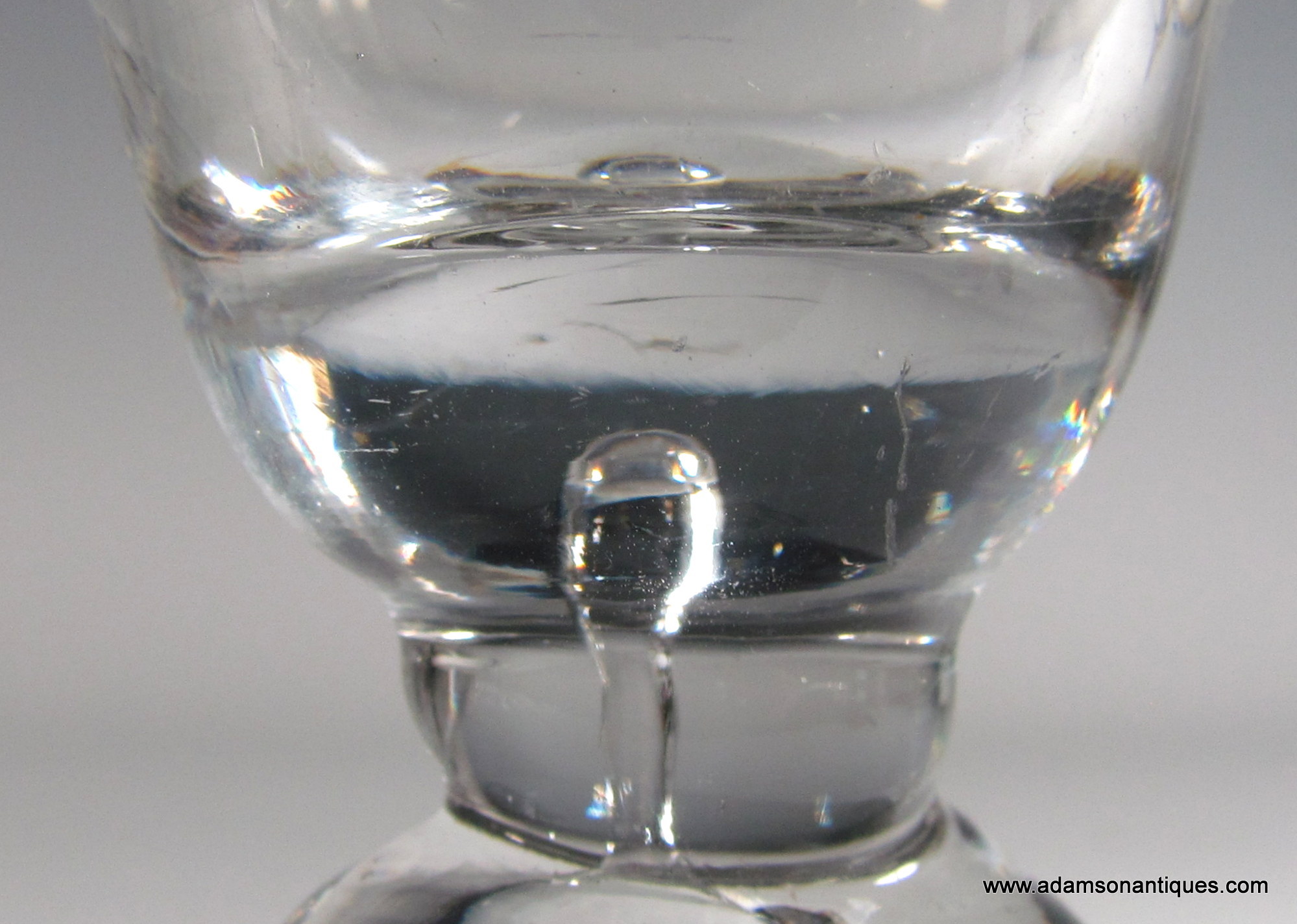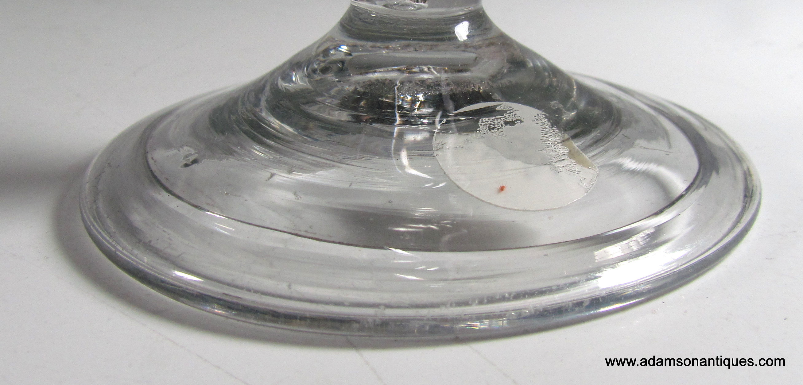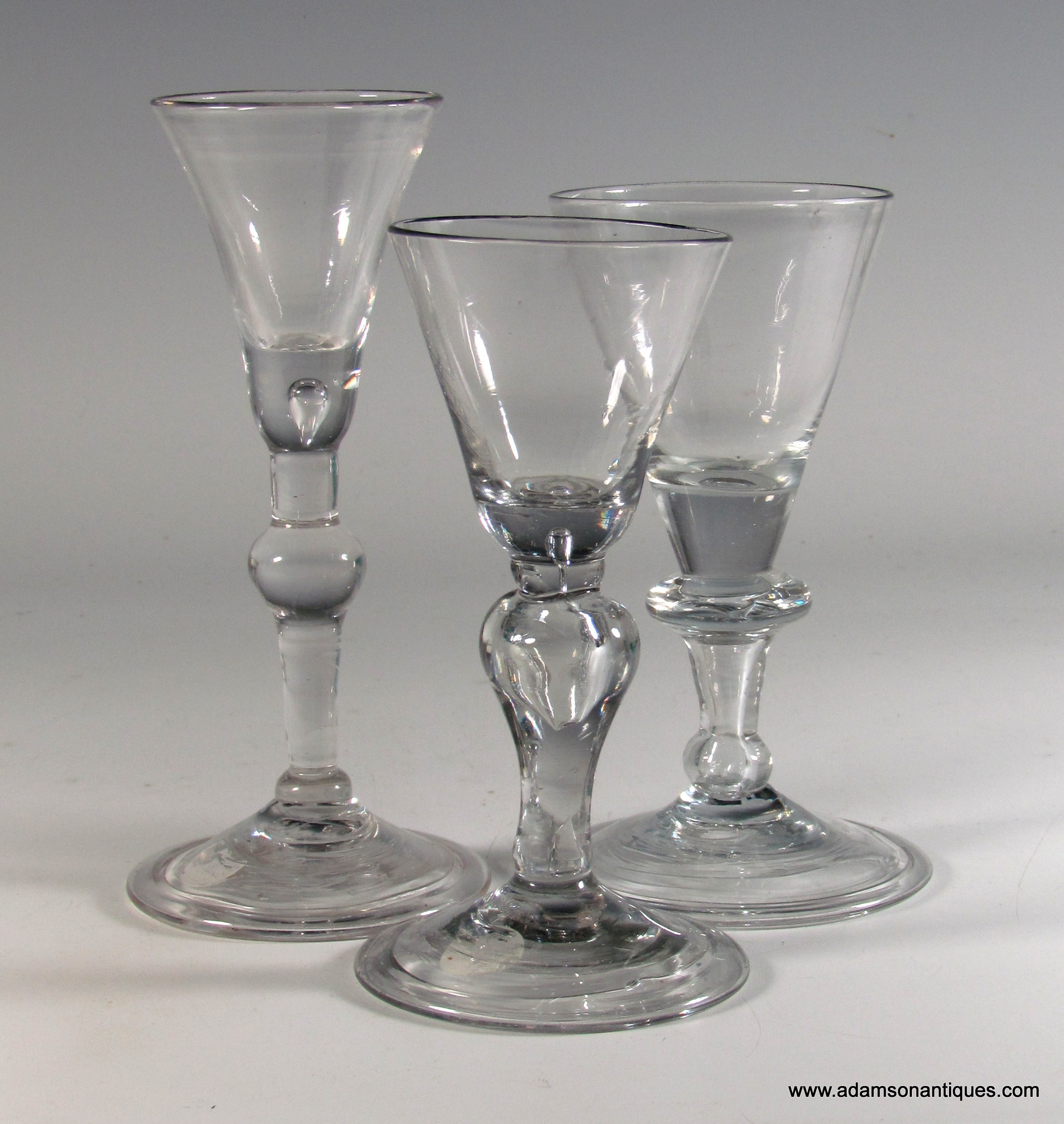A baluster wine glass having a round funnel bowl with teared solid base and half knop below, over a stem with a teared inverted baluster knop , all on a folded conical foot.
