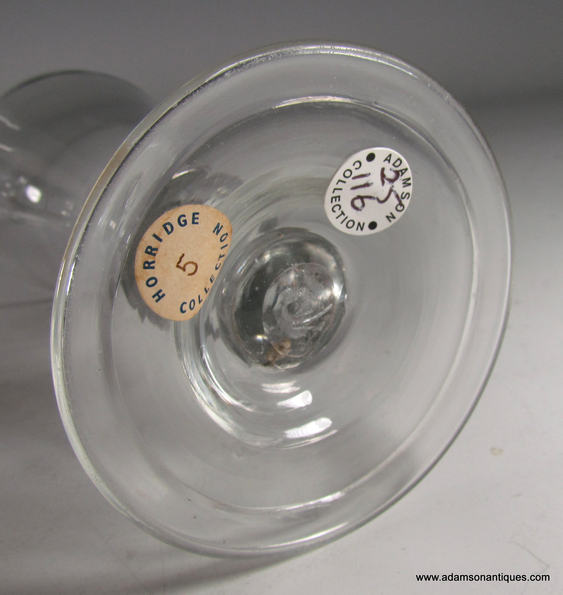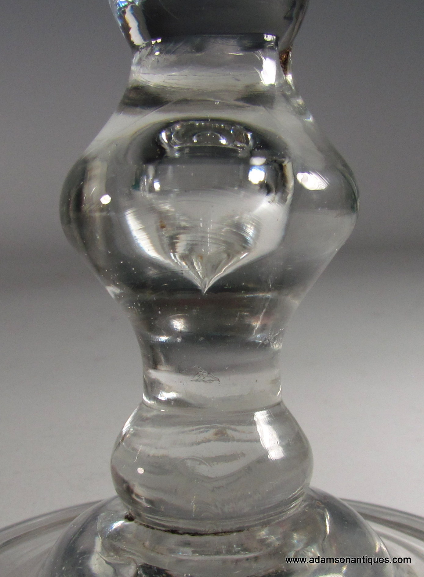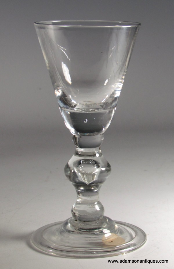 A very fine heavy baluster wine glass, having a round funnel bowl with a solid base with a half knop below , over a stem with teared angular knop and basal knop , all on a domed and folded foot ,