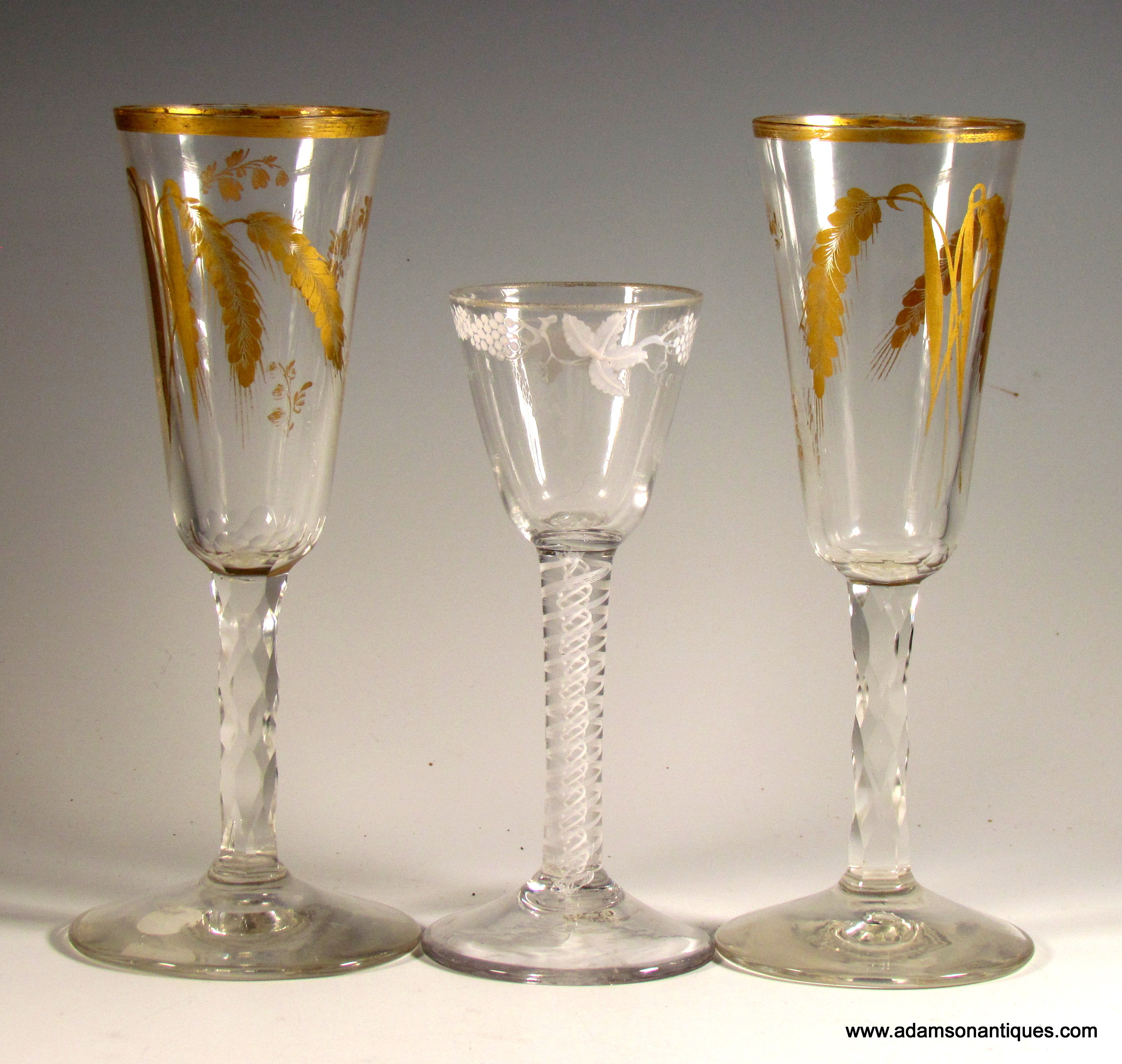 A superbly enamelled wine glass by William Beilby, having a round funnel bowl decorated with two large bunches of grapes and a pair of vine leaves,over a double series opaque twist stem ,all on a conical foot ,