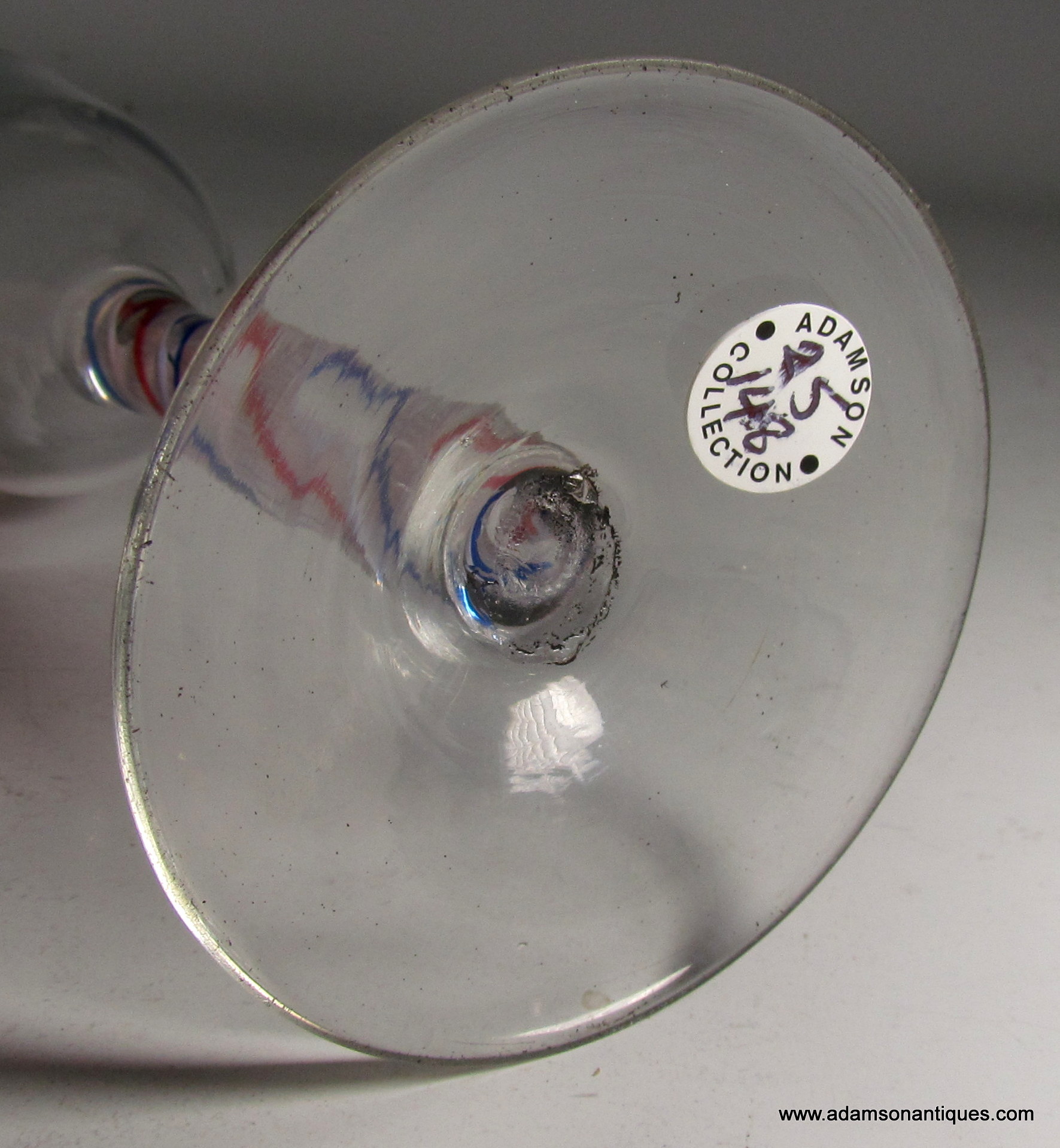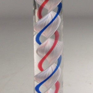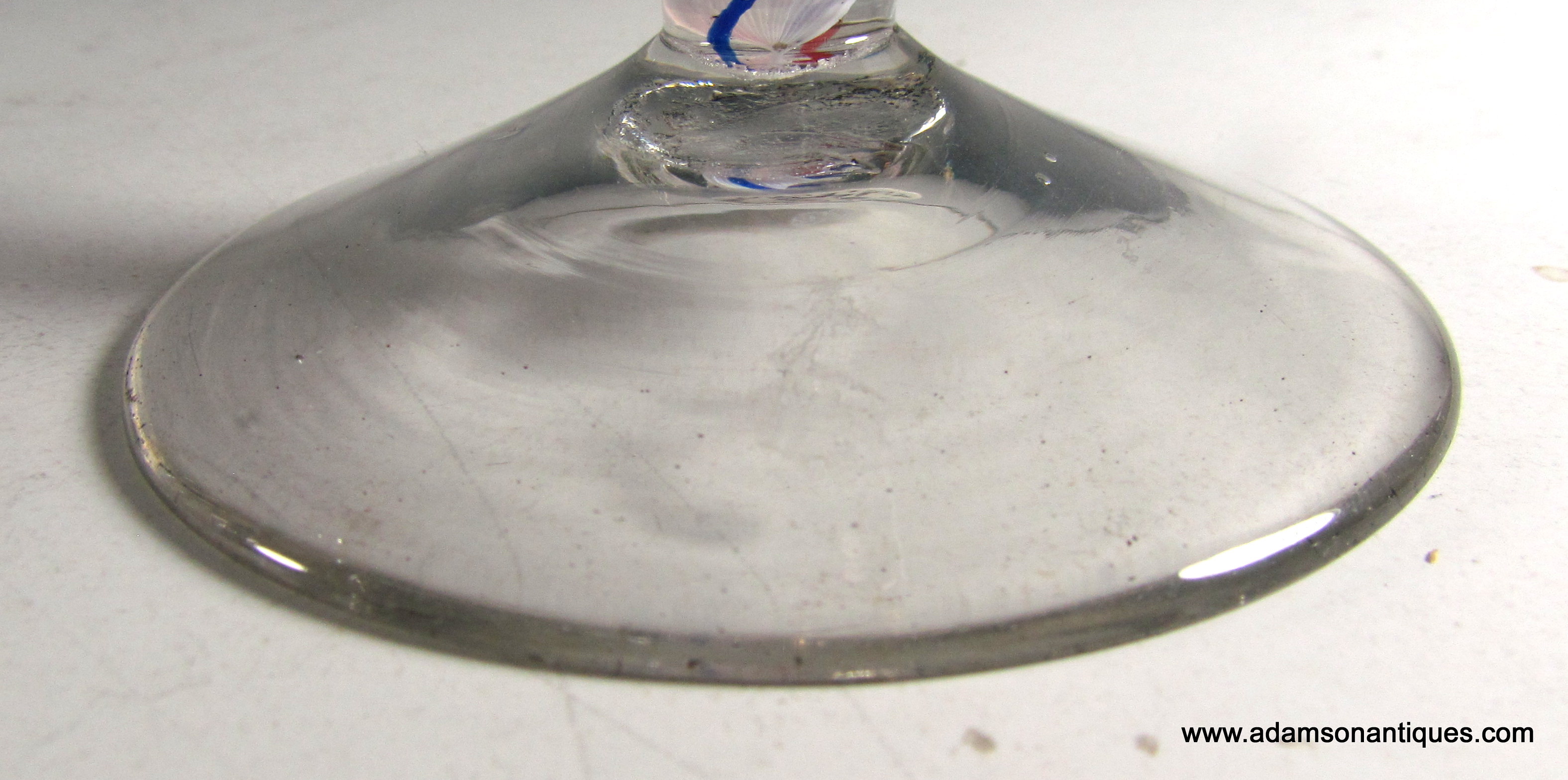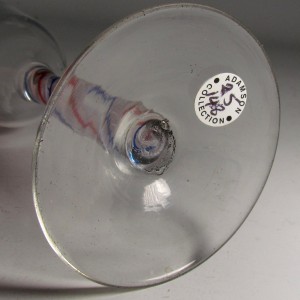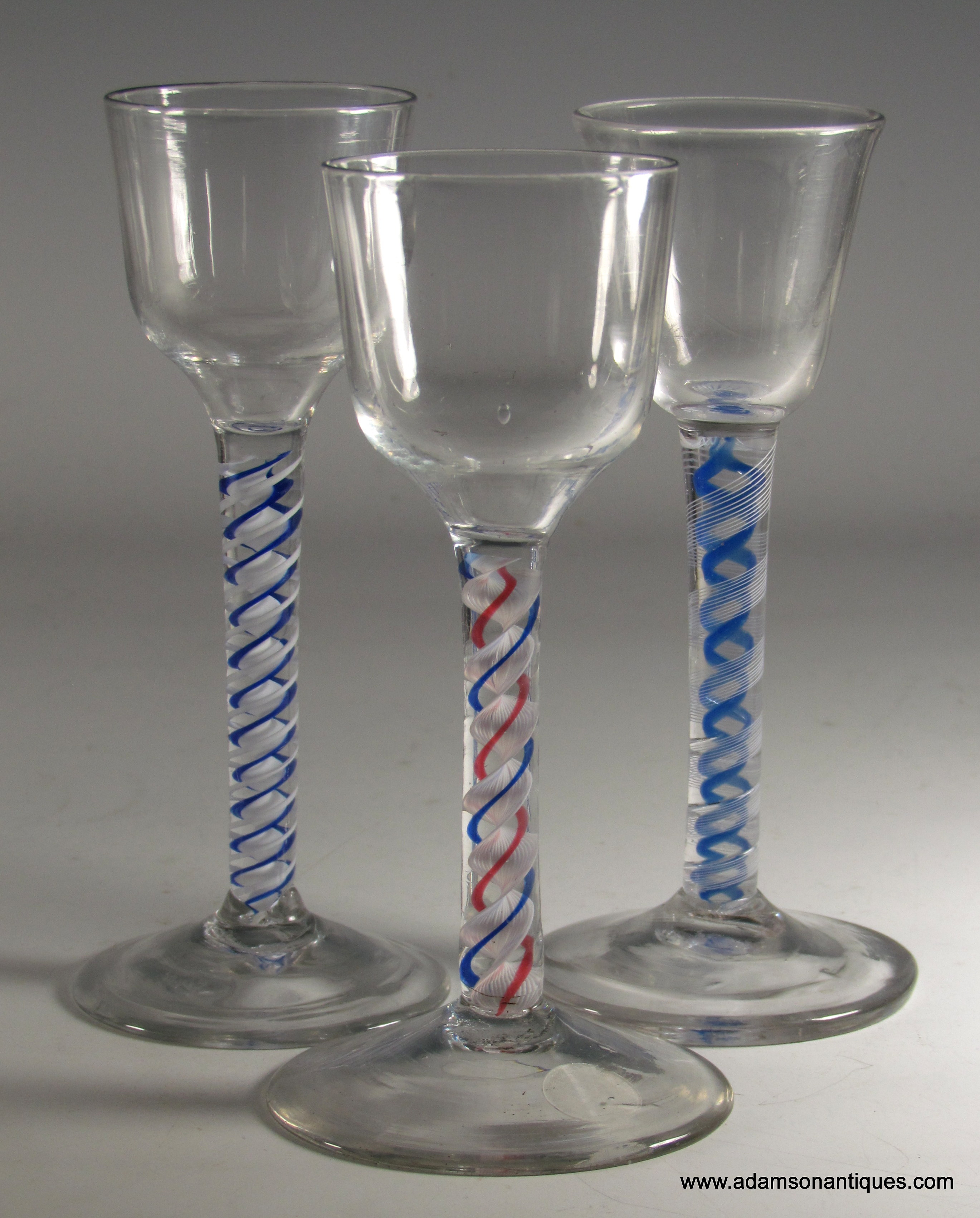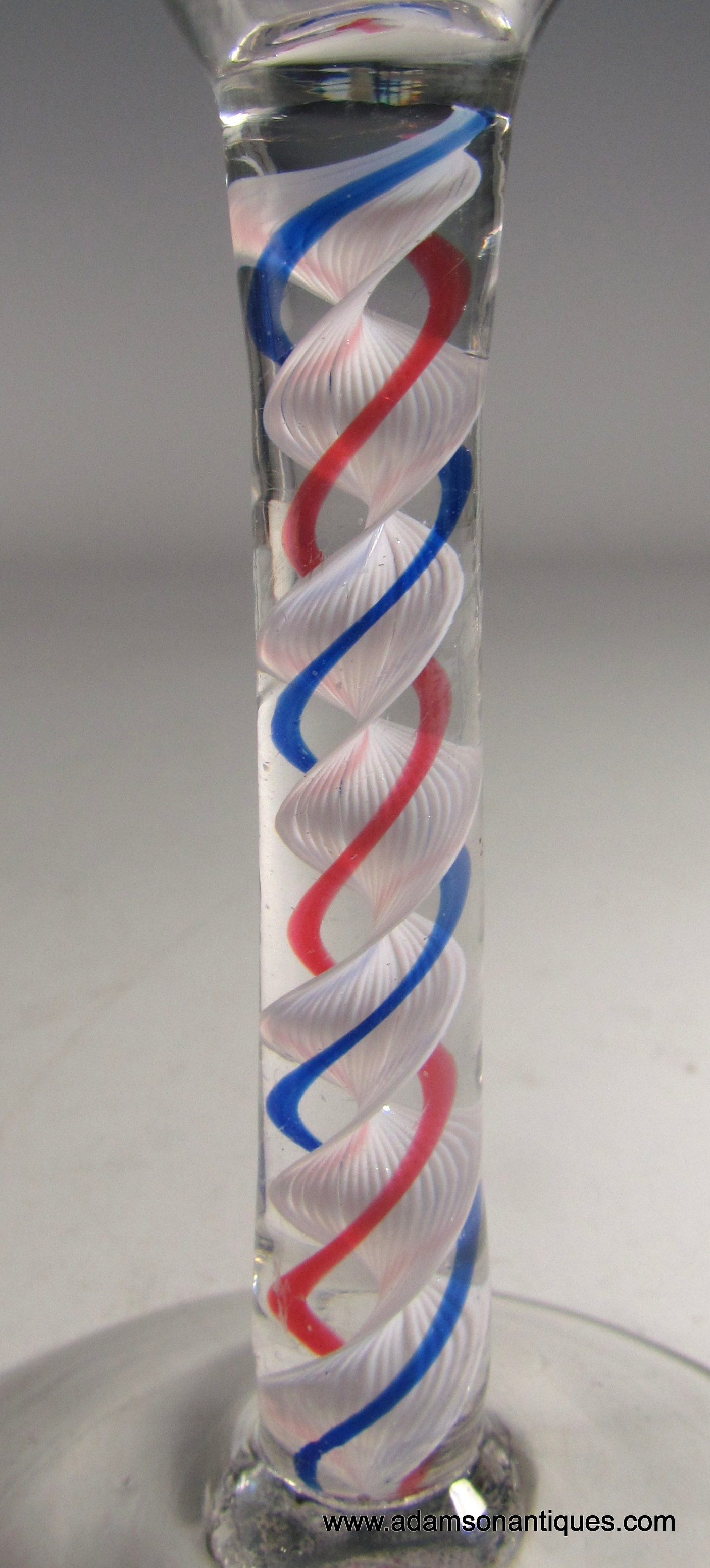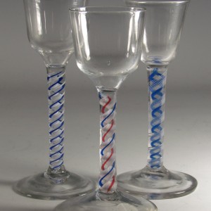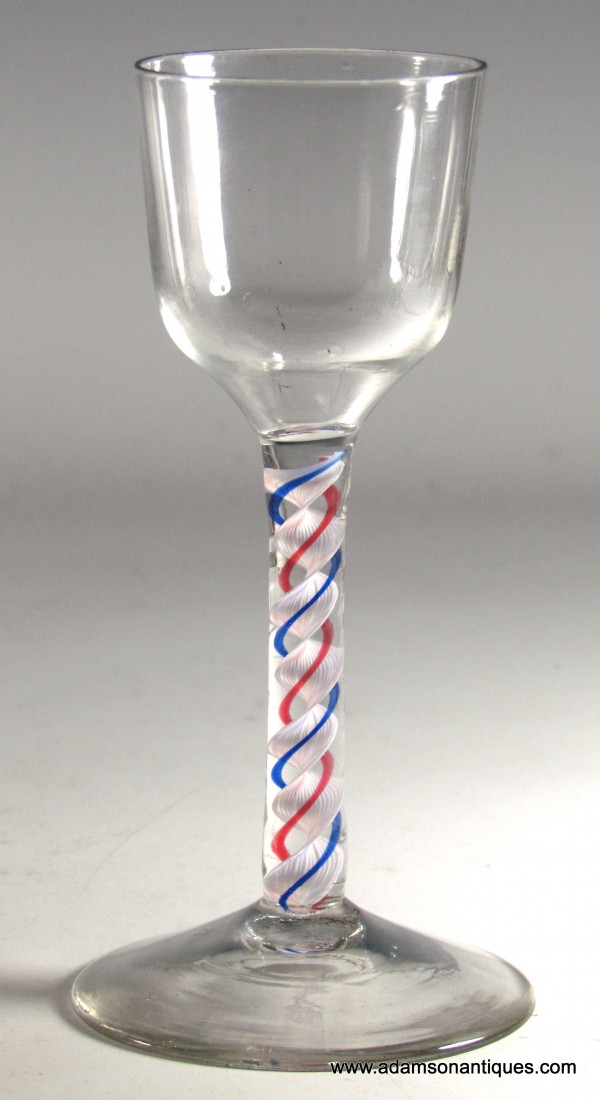 A very fine colour twist wine glass having an ogee bowl over a double series stem with a multi ply inner white corkscrew with one blue and one red thread around, all on a plain conical foot .