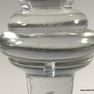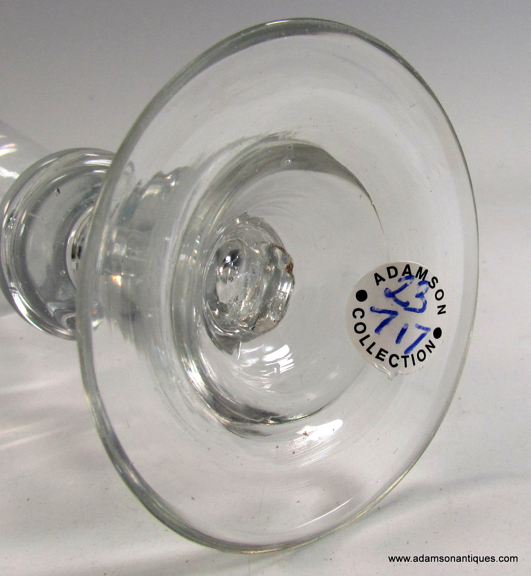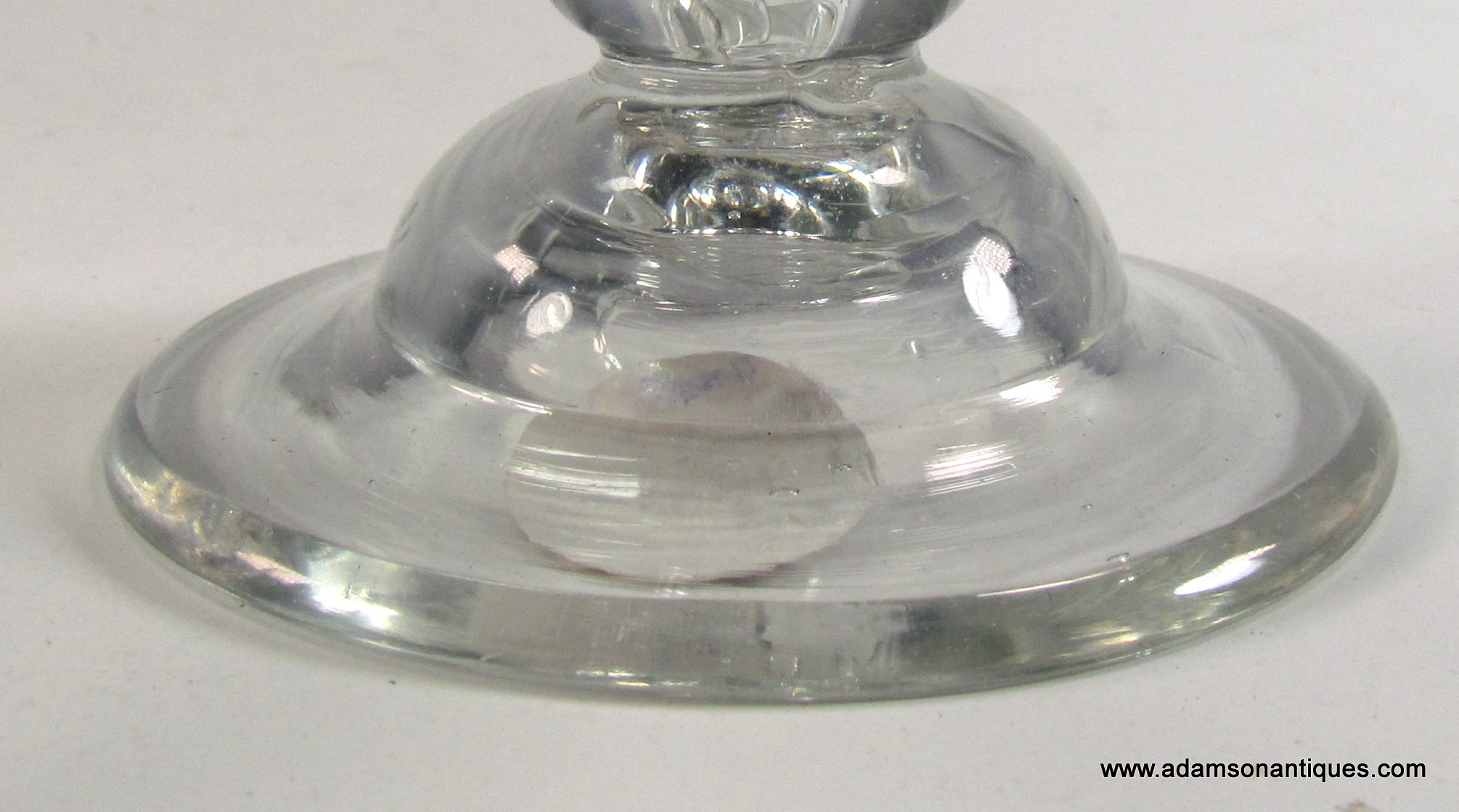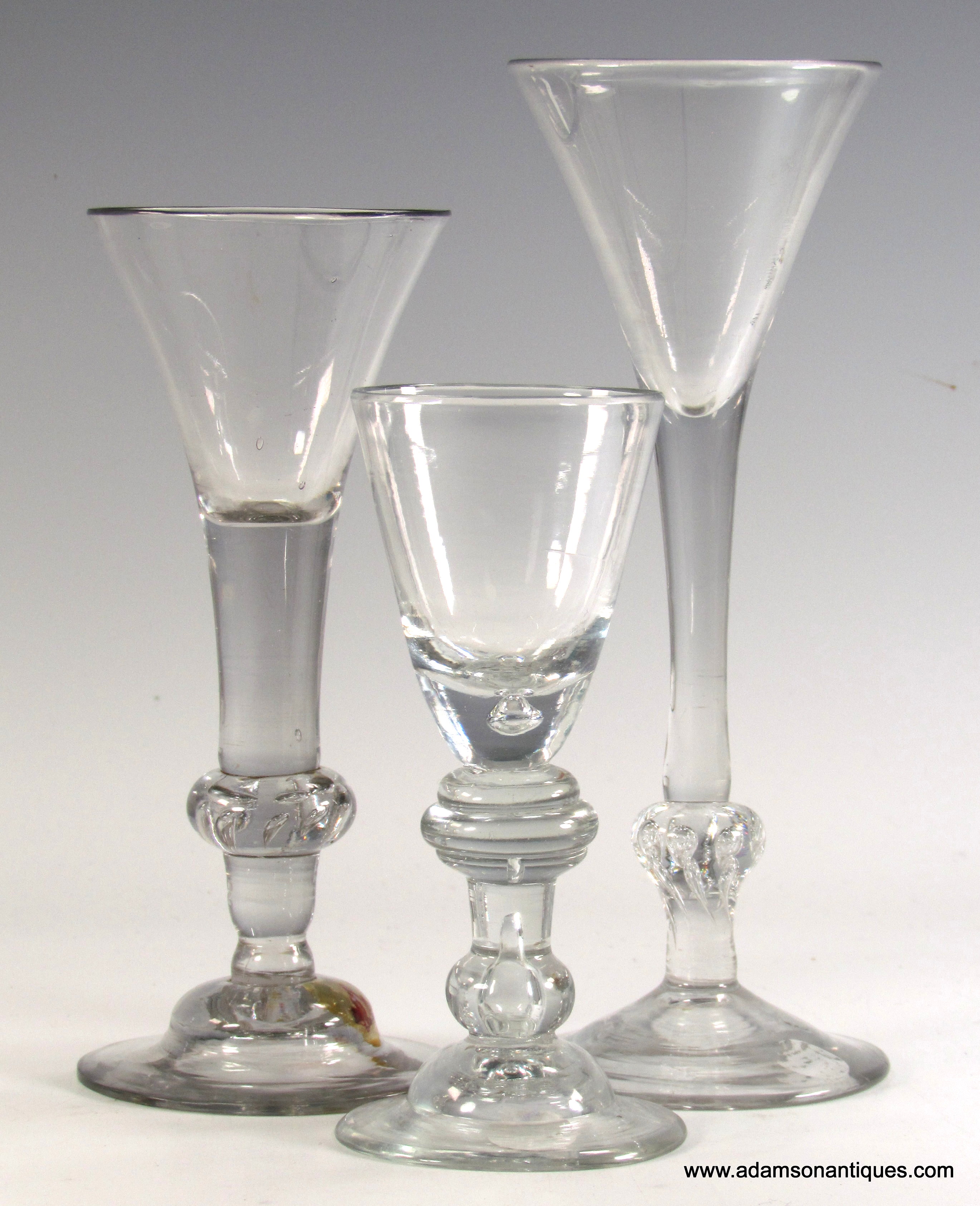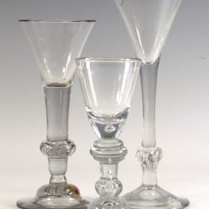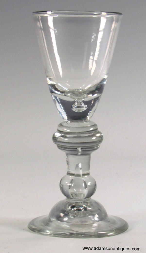 A very good early Heavy Baluster small wine or dram glass, having a pointed round funnel bowl with a solid base containing a small tear,the stem having a triple annular knop and teared basal knop, all on domed foot.