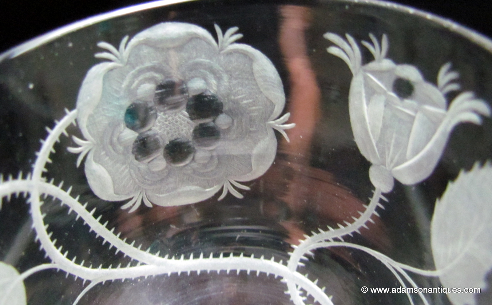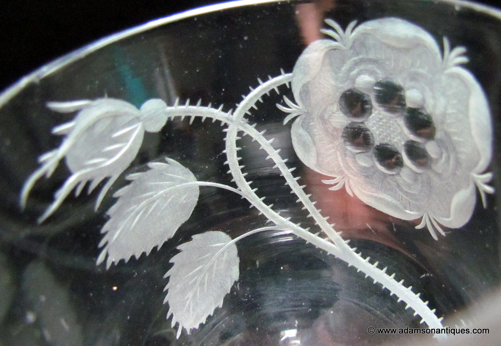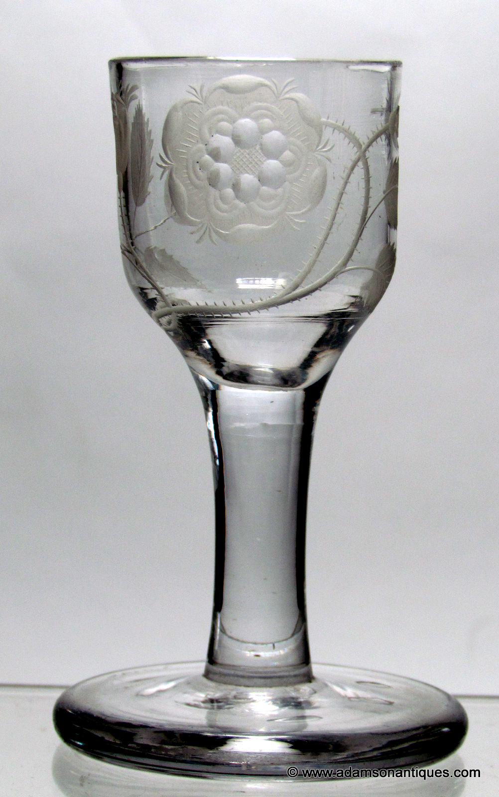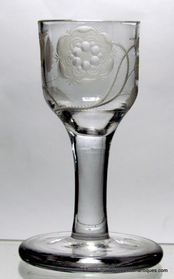An excellent Jacobite firing glass with an ogee bowl engraved with a six petaled rose, an open bud and a closed bud,all on a plain stem and thick firing foot.