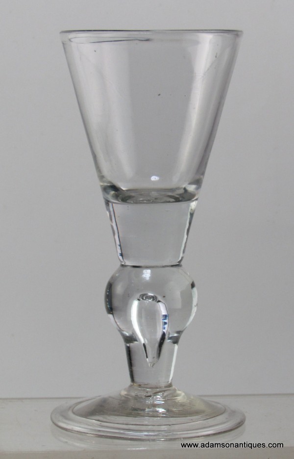 Elegant in it's simplicity of form with perfect balance this type is more frequently seen in much larger glasses from the same date described as ale glasses ( photo shown from my archive ), this may be a short ale version, the only other example I can locate ( minus the tear to stem ) is illustrated in " The Price Guide to 18th century Drinking Glasses " by Turnbull and Herron. group 1 No 8 ( which is also in the Adamson Collection ).