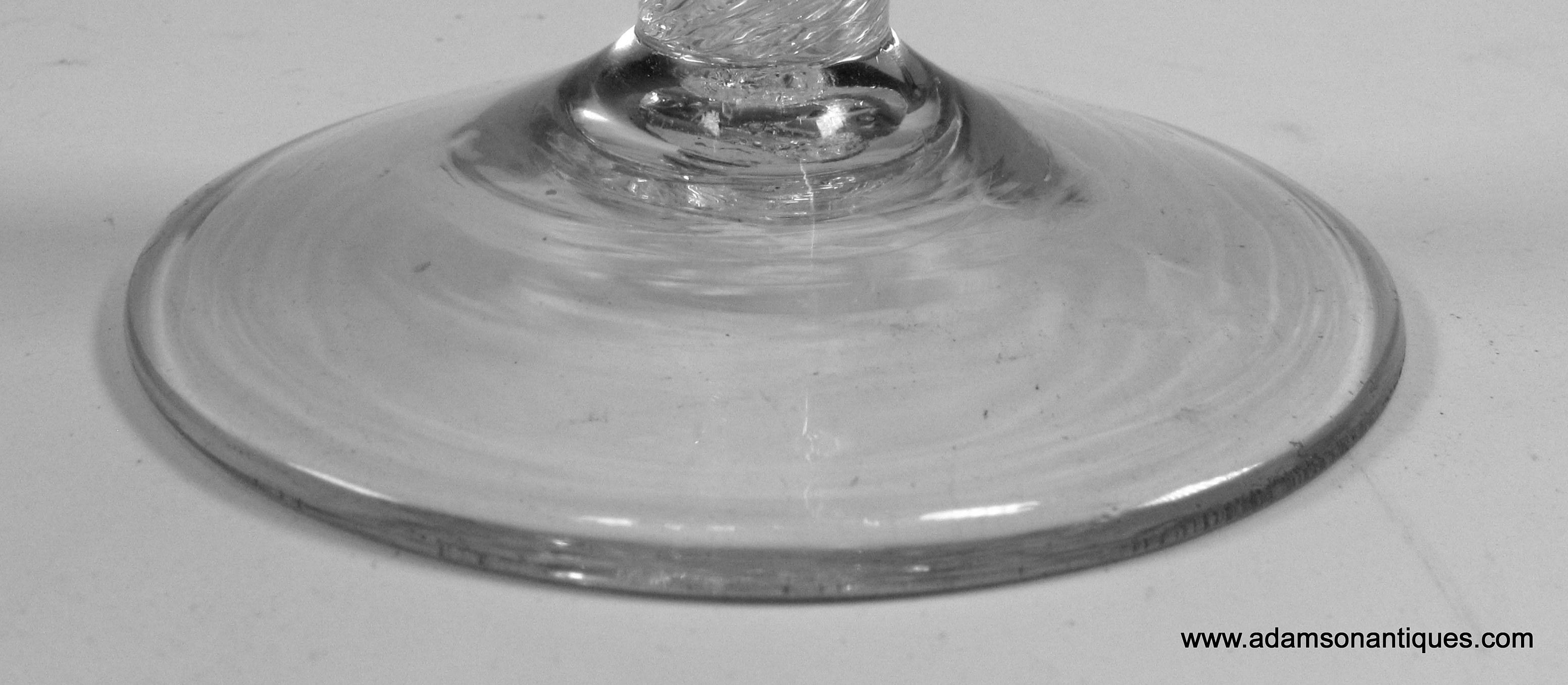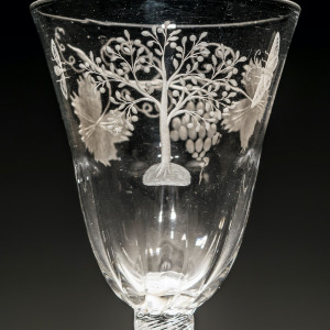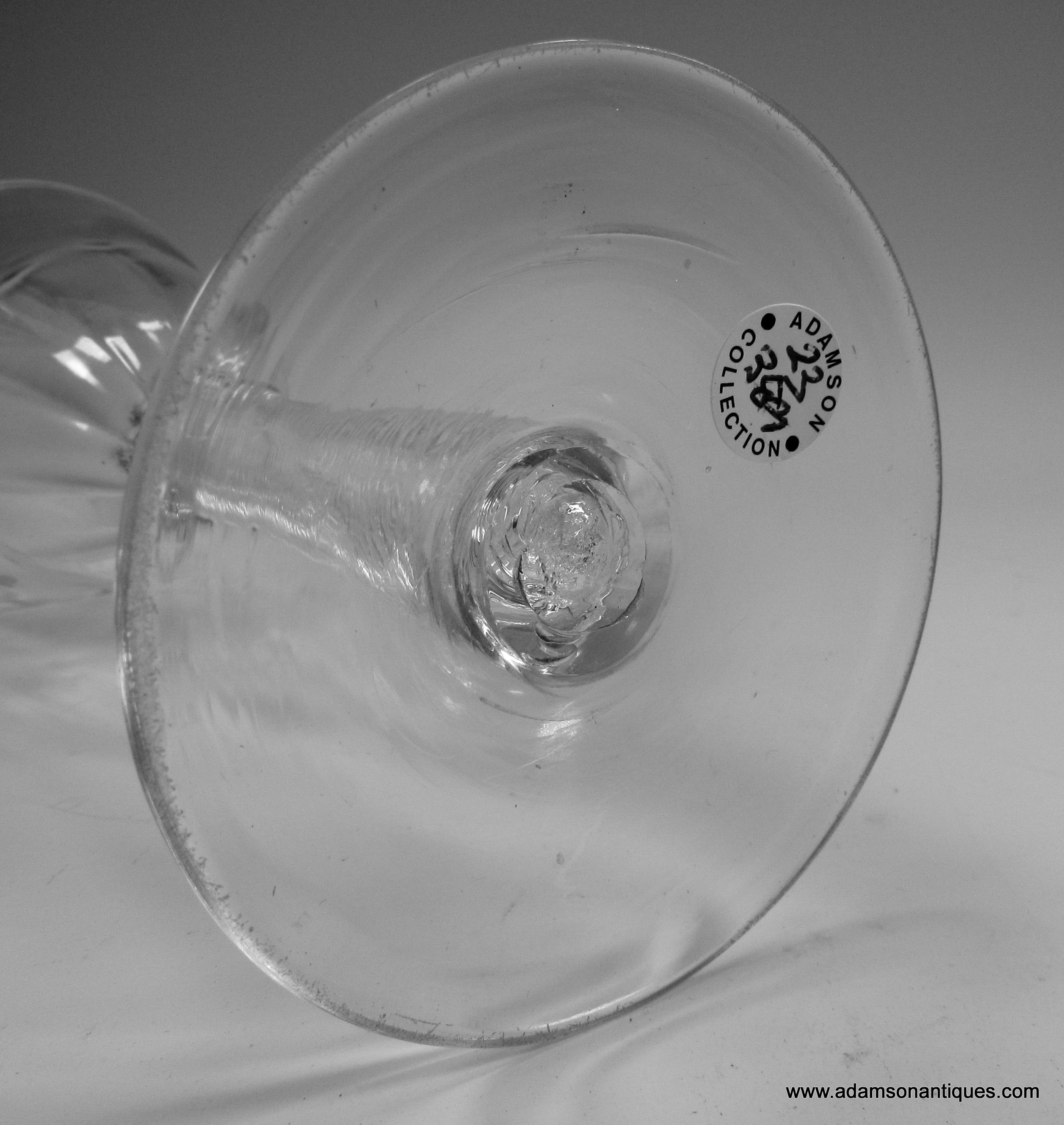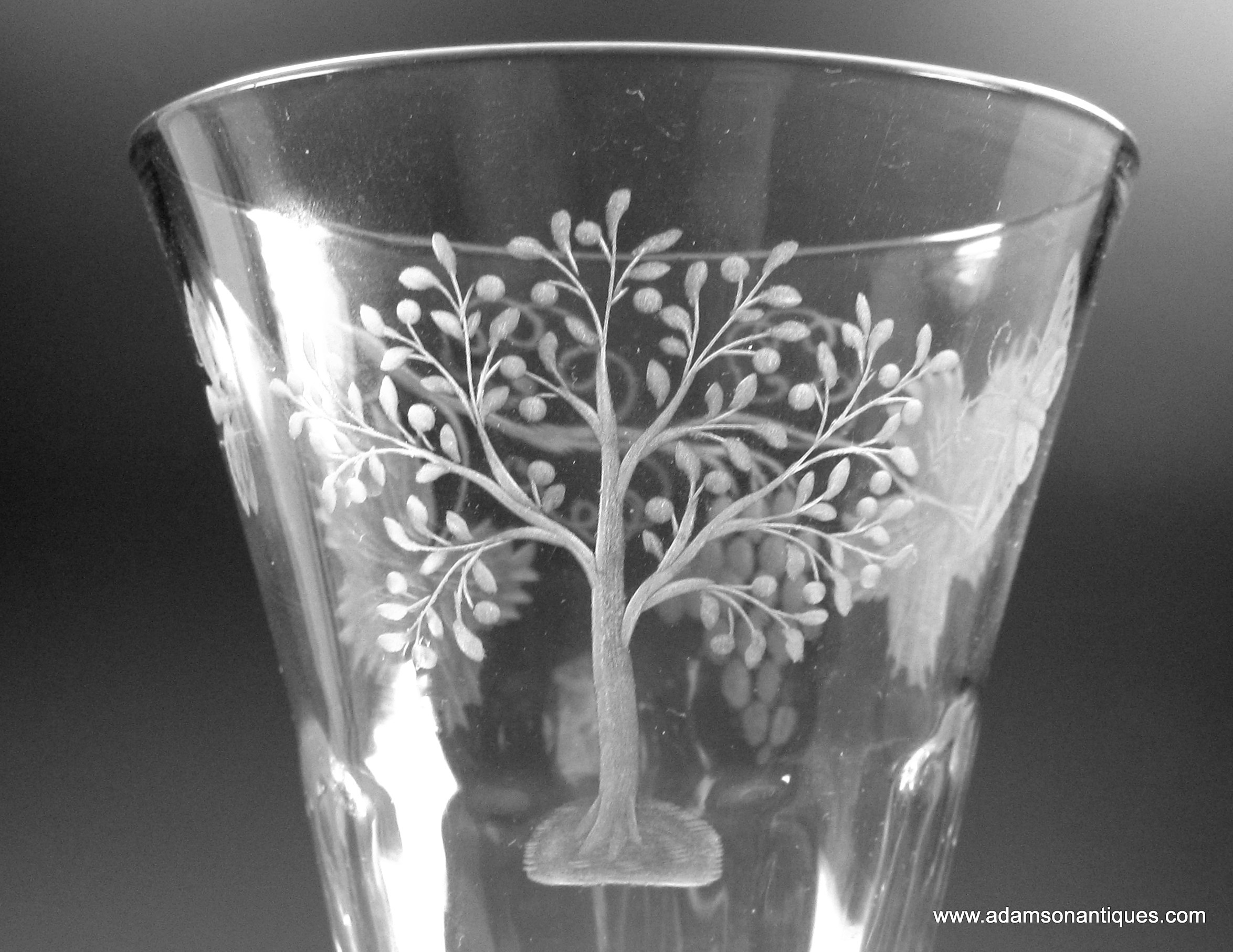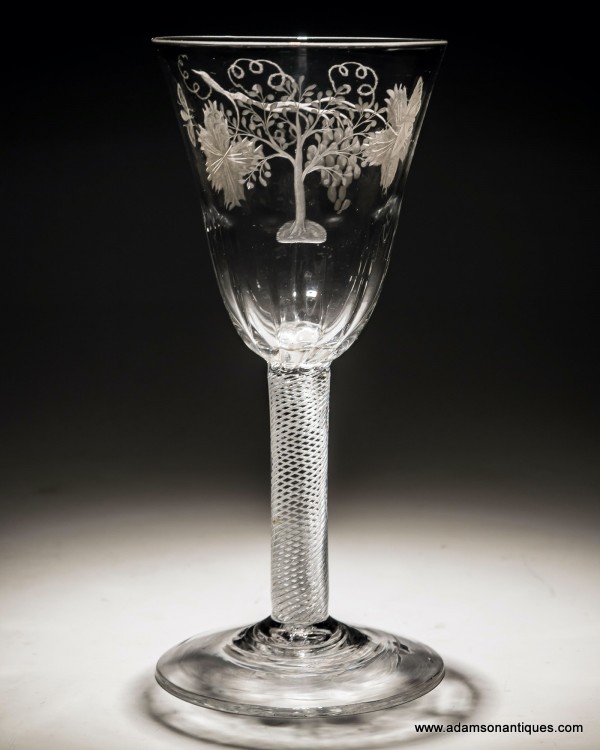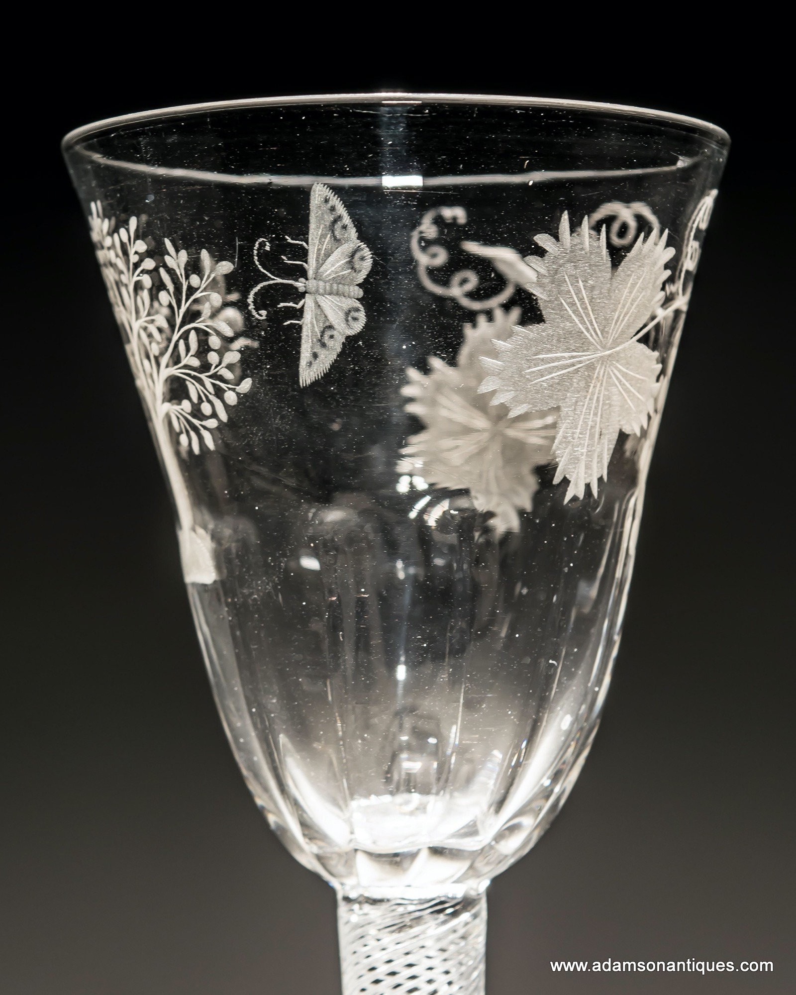 A very rare and fine cider glass, having a large round funnel bowl with fluting to the lower third, engraved with a growing apple tree with a bee and coddling moth, to the reverse it is engraved with fruiting vine. All over a multi spiral air twist stem and conical foot