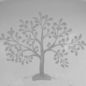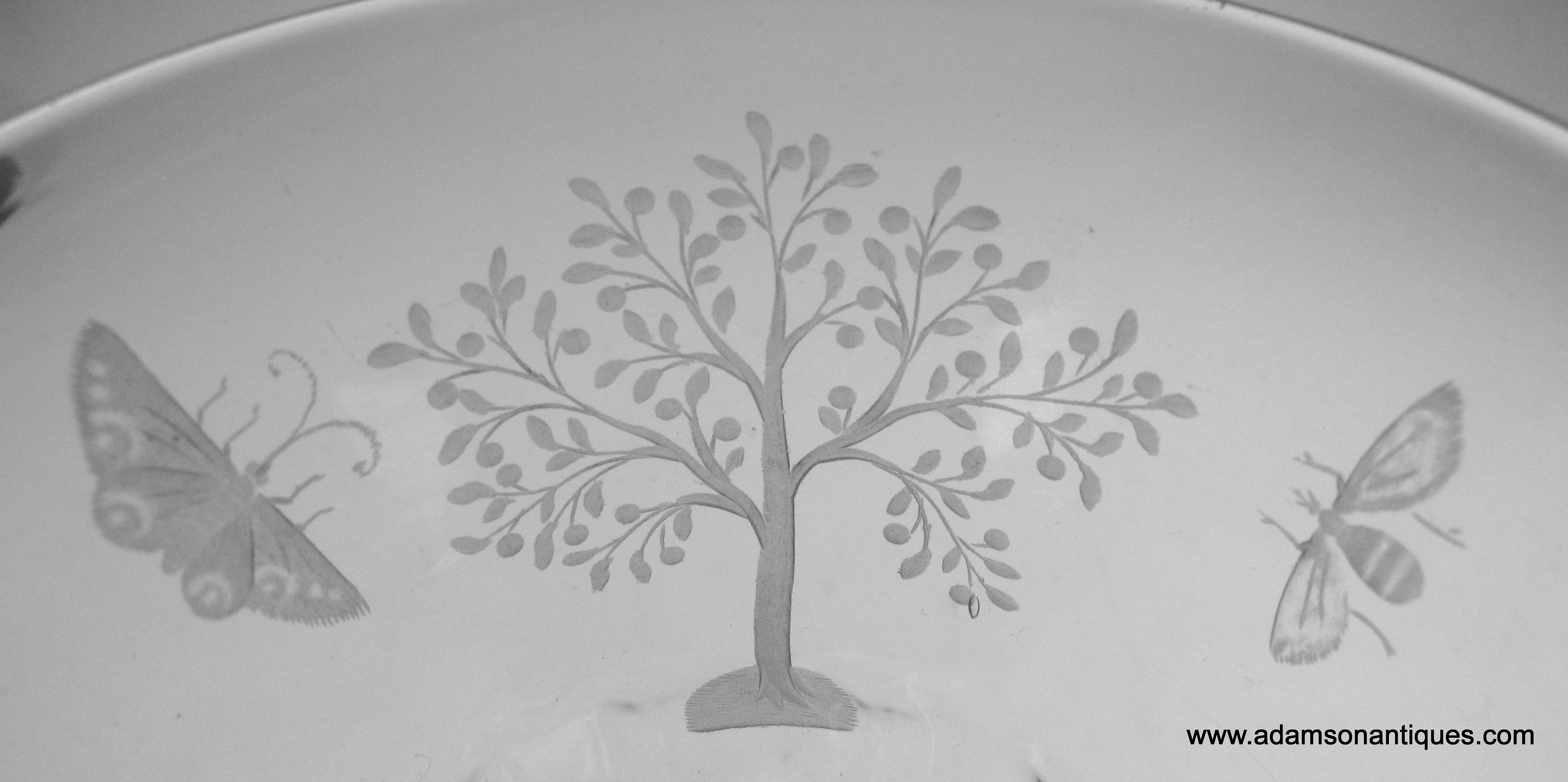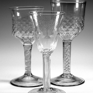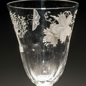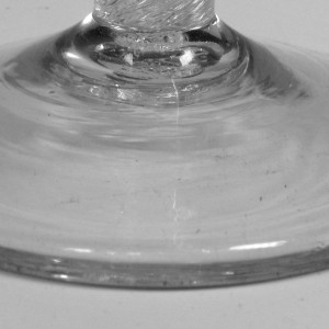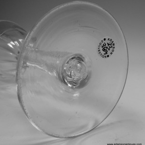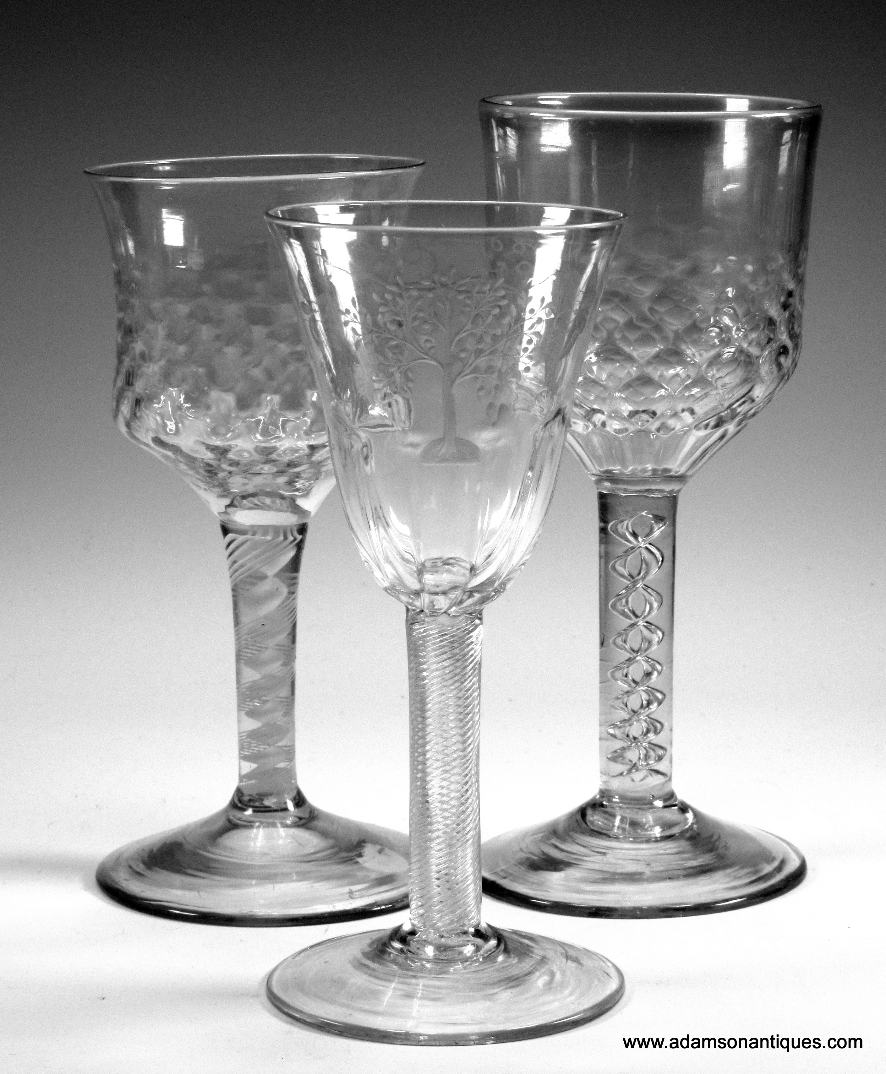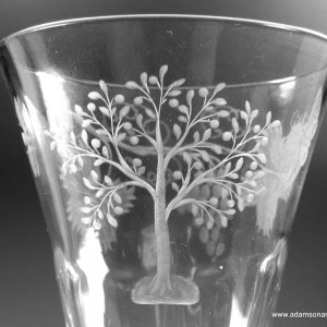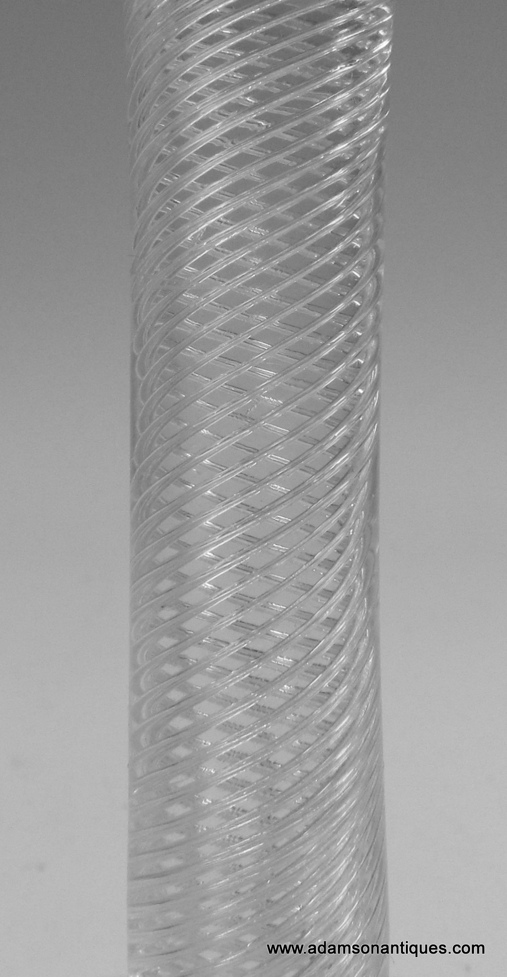 A very rare and fine cider glass, having a large round funnel bowl with fluting to the lower third, engraved with a growing apple tree with a bee and coddling moth, to the reverse it is engraved with fruiting vine. All over a multi spiral air twist stem and conical foot
